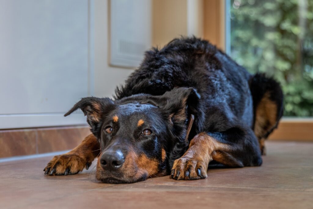 Ich bin eine Beauceron-Hündin, seit Dezember 2022 in der Huber-Familie und Mitglied des Büroteams.